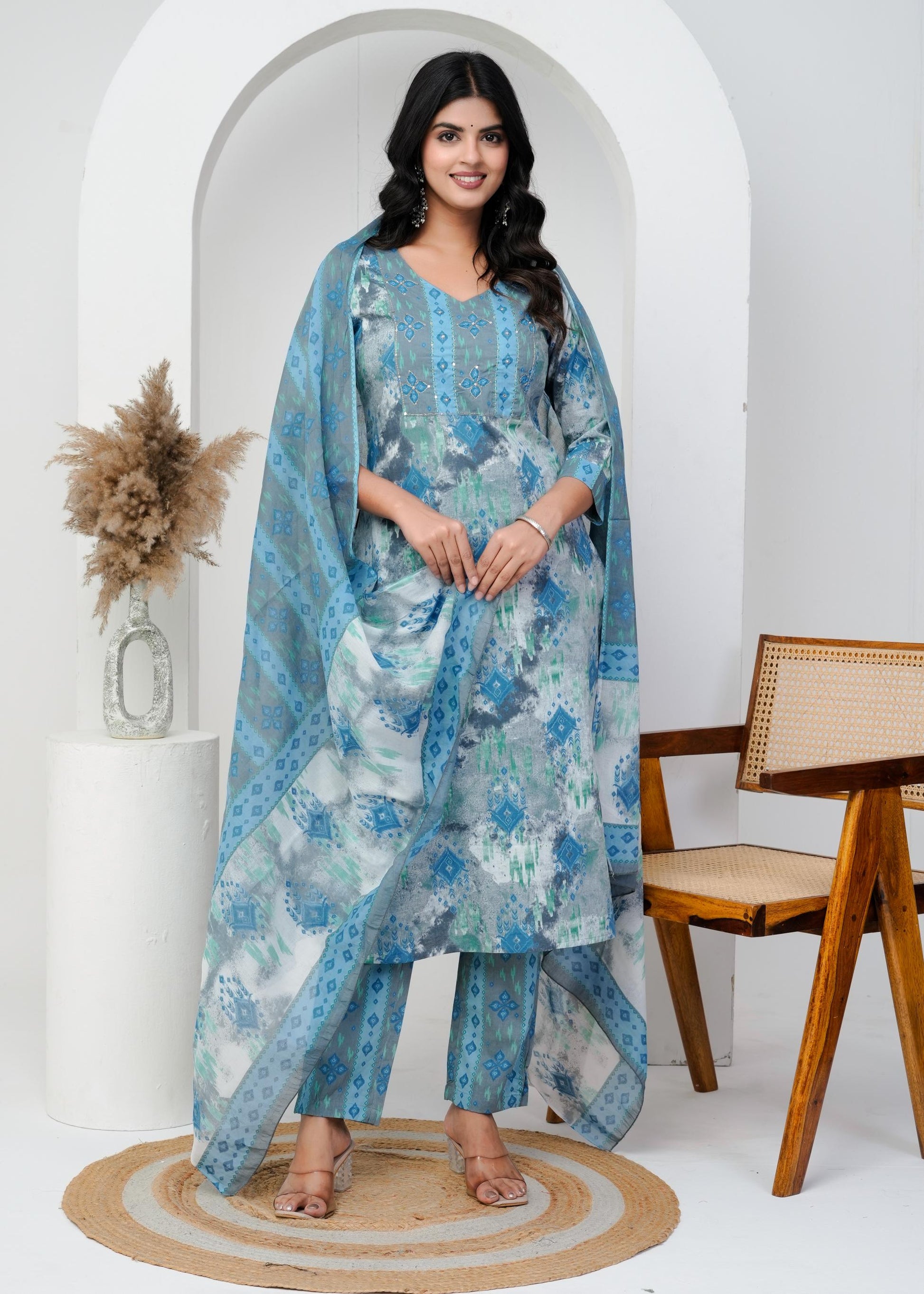 Elevate your ethnic wardrobe with this Cotton Floral Printed Straight Kurta Set, paired gracefully with a matching dupatta. Crafted from breathable cotton, it ensures comfort and elegance throughout the day. The delicate floral print adds a timeless charm, while the straight cut silhouette offers a refined and flattering fit. Perfect for both casual gatherings and festive occasions, this set blends traditional aesthetics with modern sophistication effortlessly.