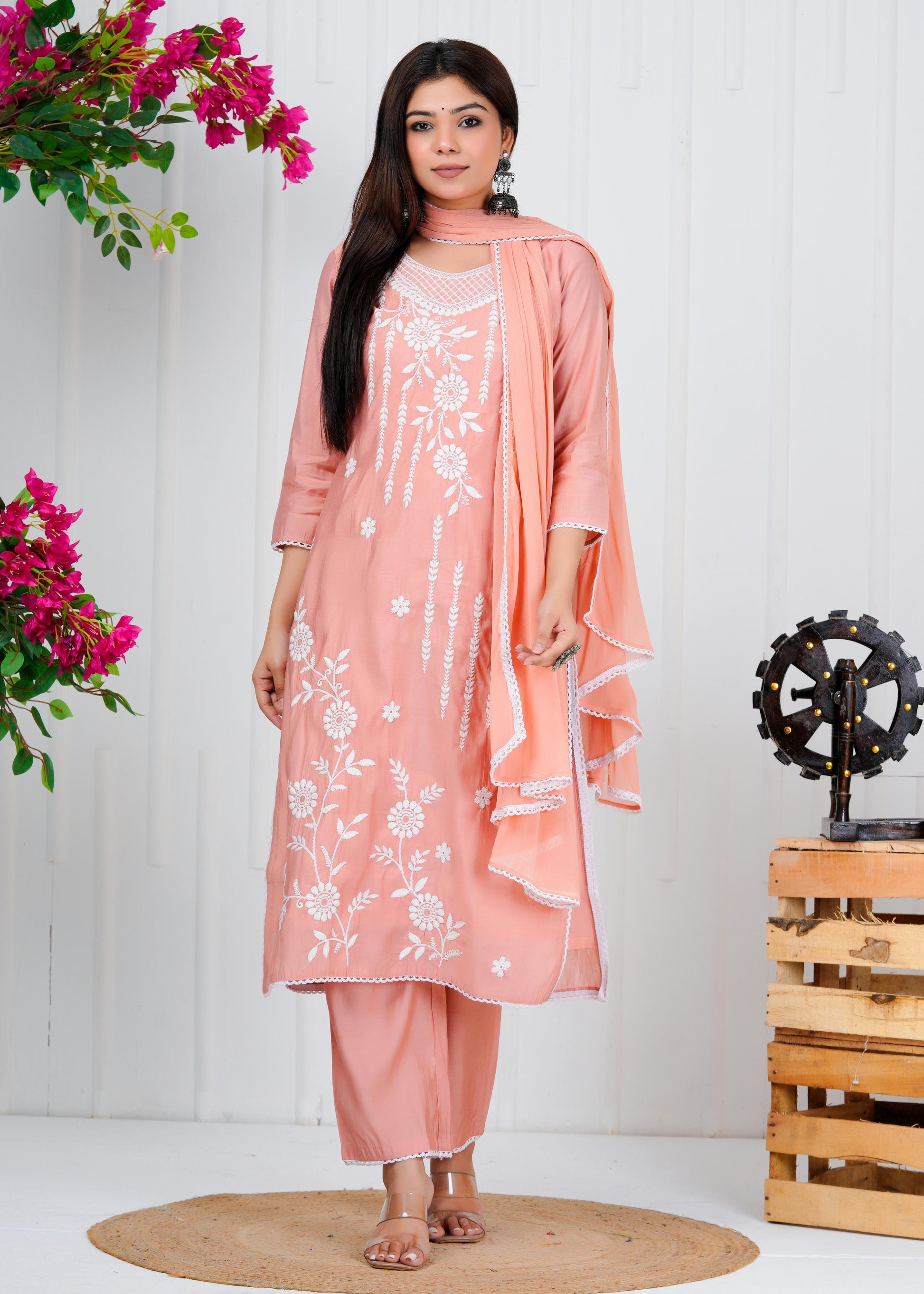 Cotton Floral Embroidered Straight Kurta Set With Dupatta