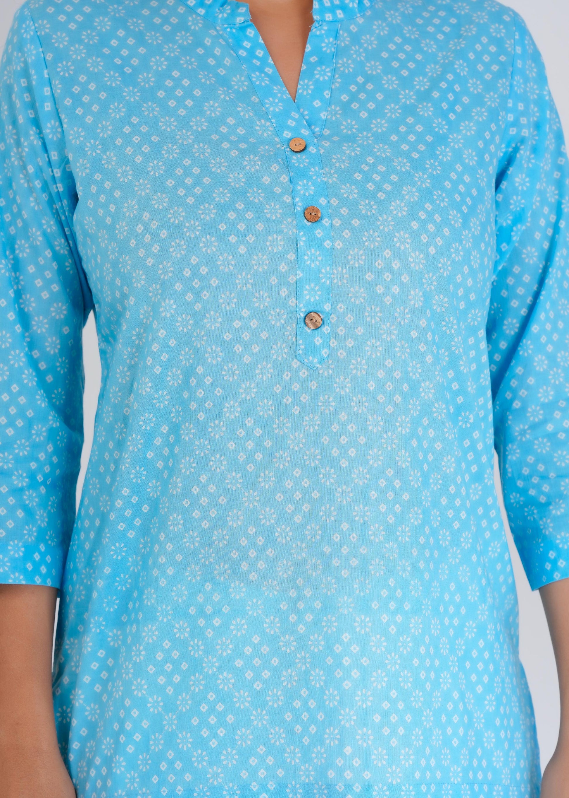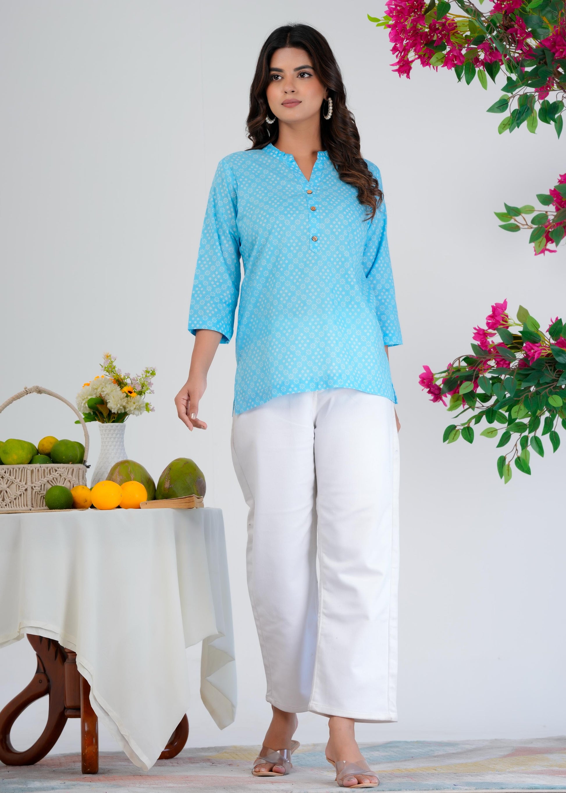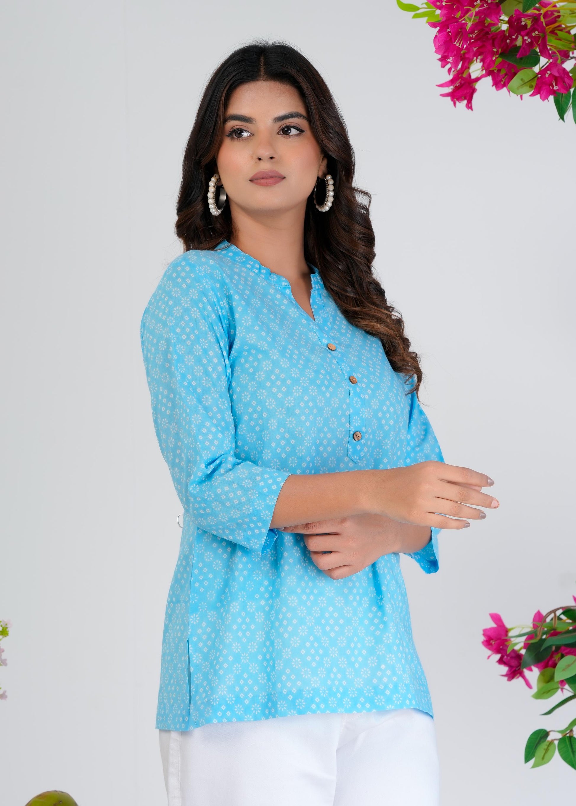 Elevate your everyday wardrobe with this Cotton Printed Regular Blue Top, crafted for both comfort and style. Made from soft, breathable cotton, it offers a relaxed fit that moves with you effortlessly. The subtle print adds a refined touch, making it perfect for casual settings or polished layering. Experience timeless elegance with a top designed to keep you looking effortlessly sophisticated throughout the day.