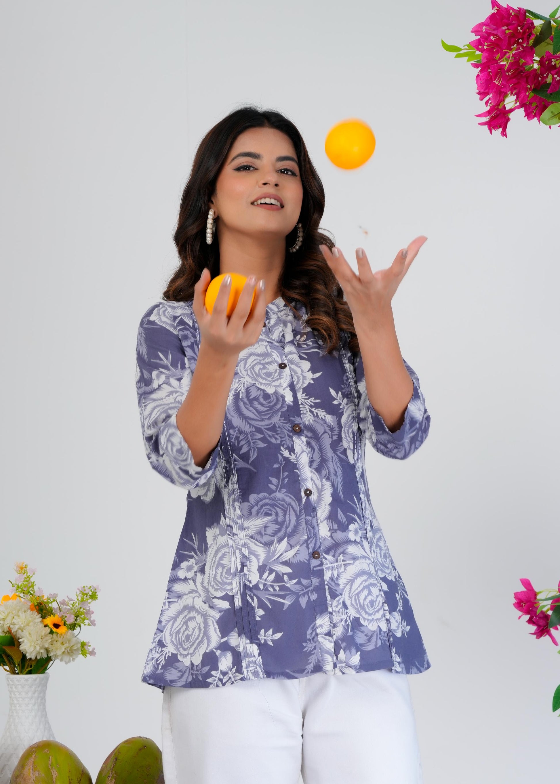 This cotton printed blue top combines timeless elegance with everyday comfort. Its regular fit enhances your silhouette subtly while the breathable fabric ensures all-day ease. Perfect for both casual outings and refined occasions, it adds a sophisticated touch to your wardrobe with its delicate print and classic hue.