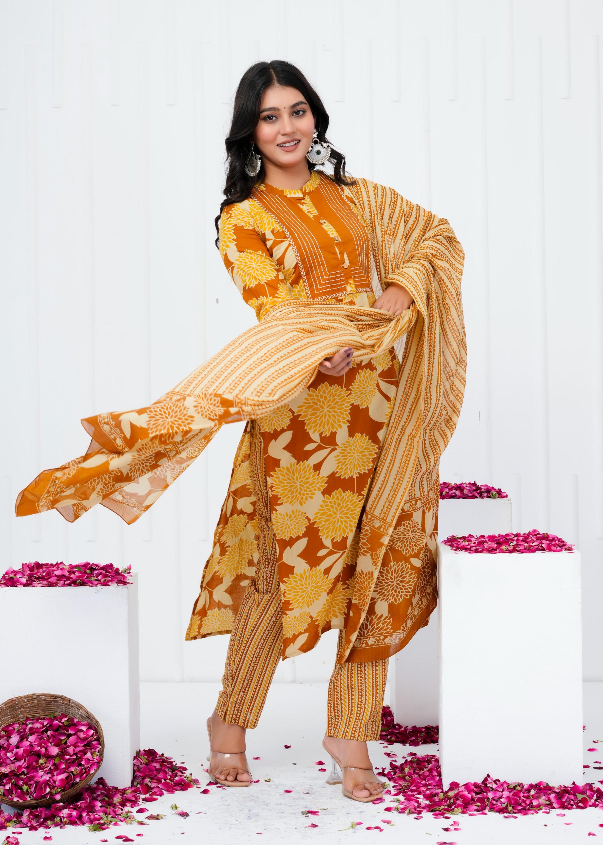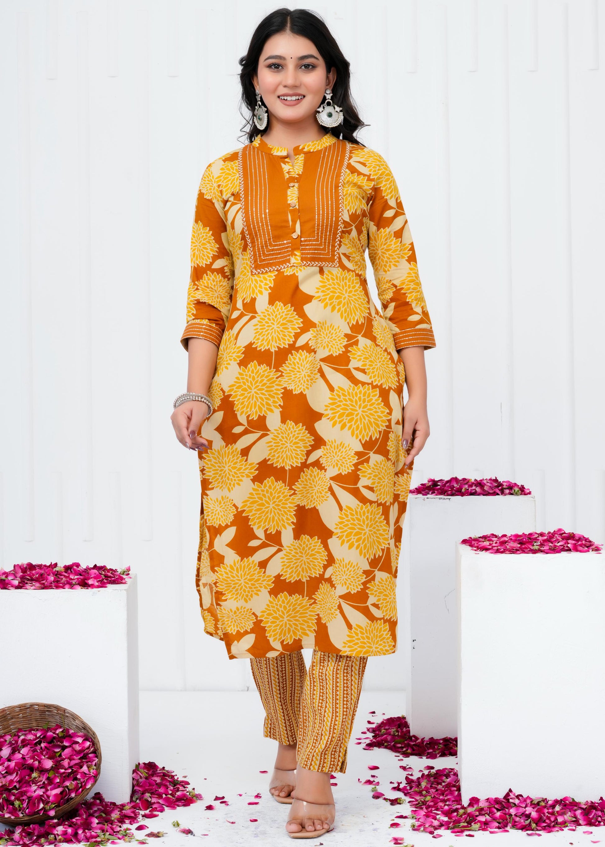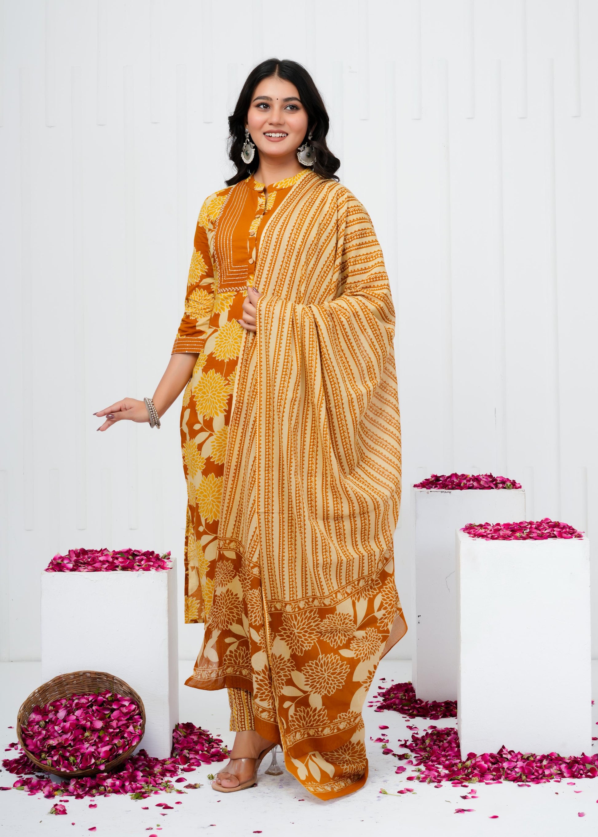 Elevate your everyday wardrobe with this refined cotton printed straight kurta set, designed for the modern woman who values both comfort and elegance. Crafted from breathable cotton fabric, this ensemble features an intricately printed pattern that adds visual interest while maintaining a timeless appeal. The straight silhouette offers a flattering, versatile fit suitable for casual gatherings, festive occasions, or leisurely days at home. Complemented by a coordinating dupatta, this three-piece set provides endless styling possibilities. Perfect for those seeking quality craftsmanship and understated sophistication in traditional wear.
