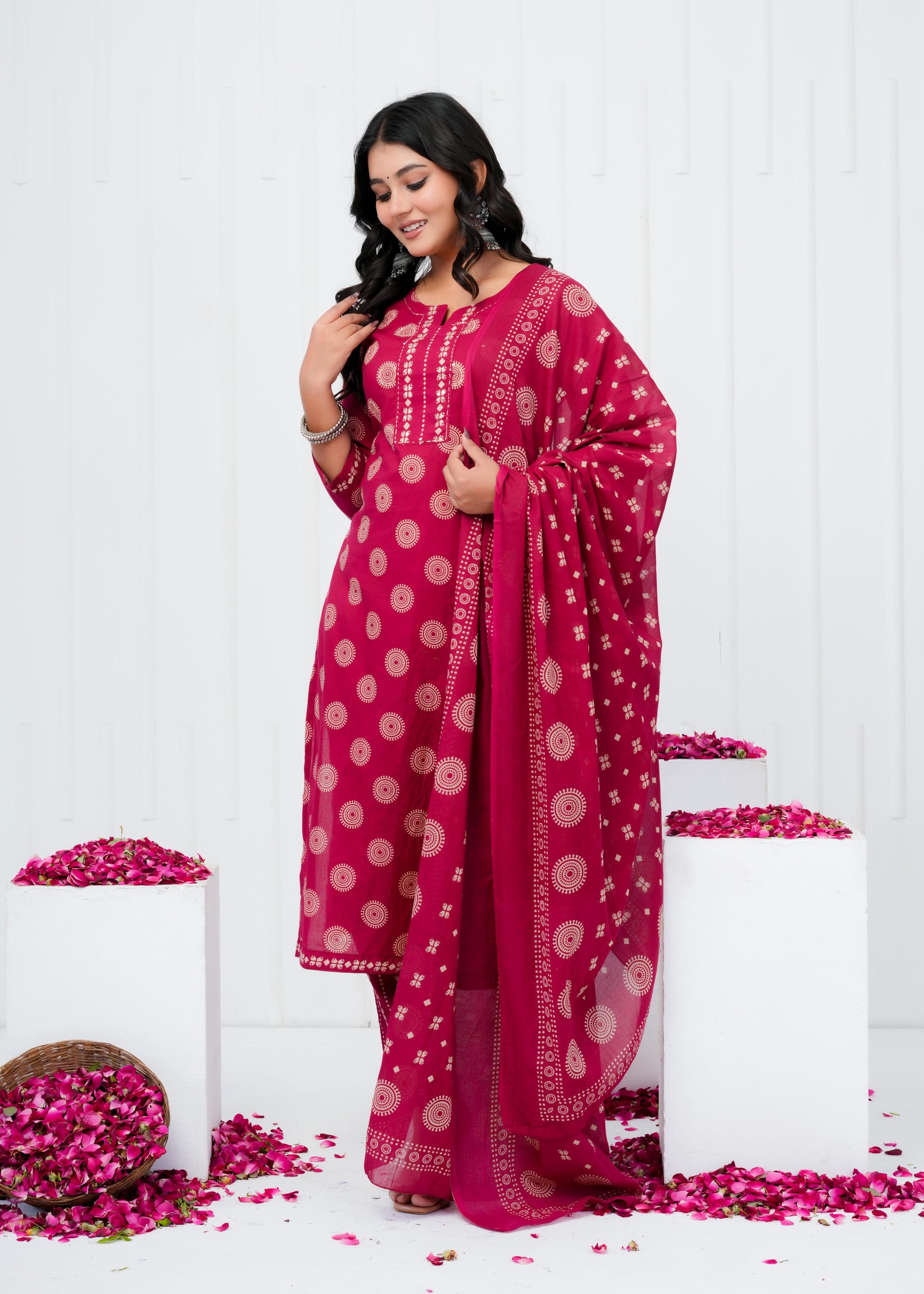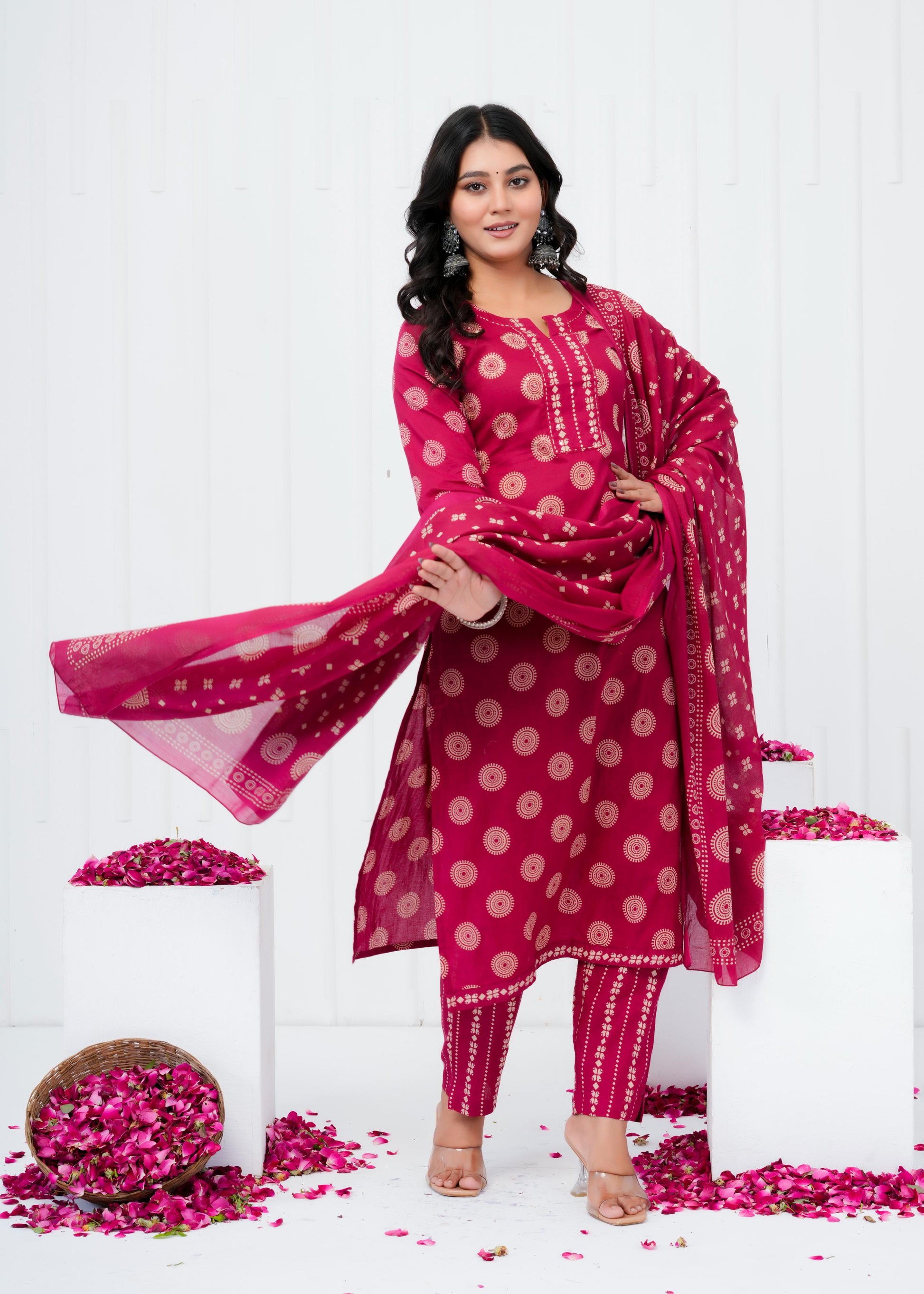 Elevate your everyday wardrobe with this refined cotton printed straight kurta set, designed for the modern woman who values both comfort and elegance. Crafted from breathable cotton fabric, this ensemble features an intricately printed pattern that adds visual interest while maintaining a timeless appeal. The straight silhouette offers a flattering, versatile fit suitable for casual gatherings, festive occasions, or leisurely days at home. Complemented by a coordinating dupatta, this three-piece set provides endless styling possibilities. Perfect for those seeking quality craftsmanship and understated sophistication in traditional wear.